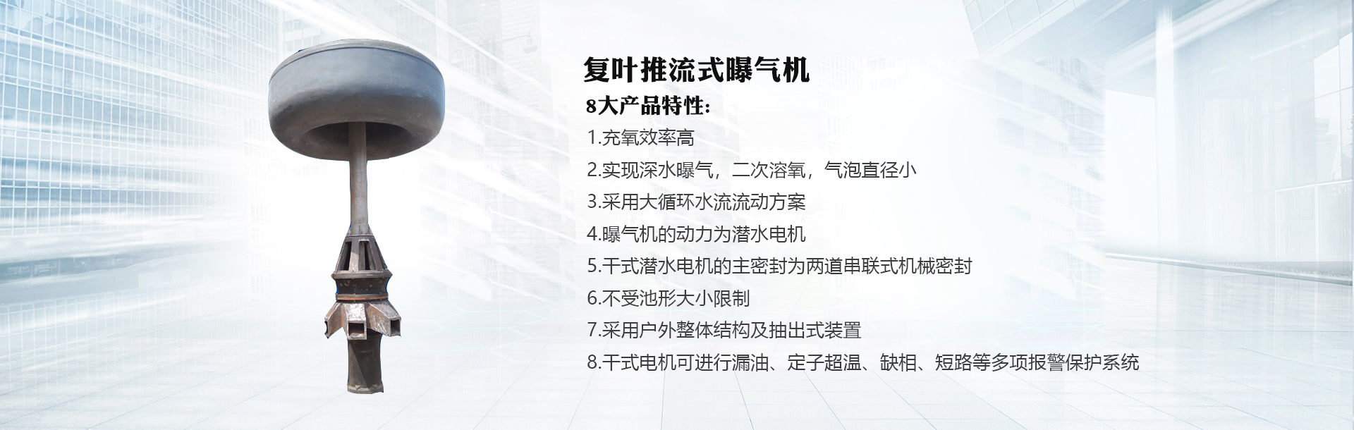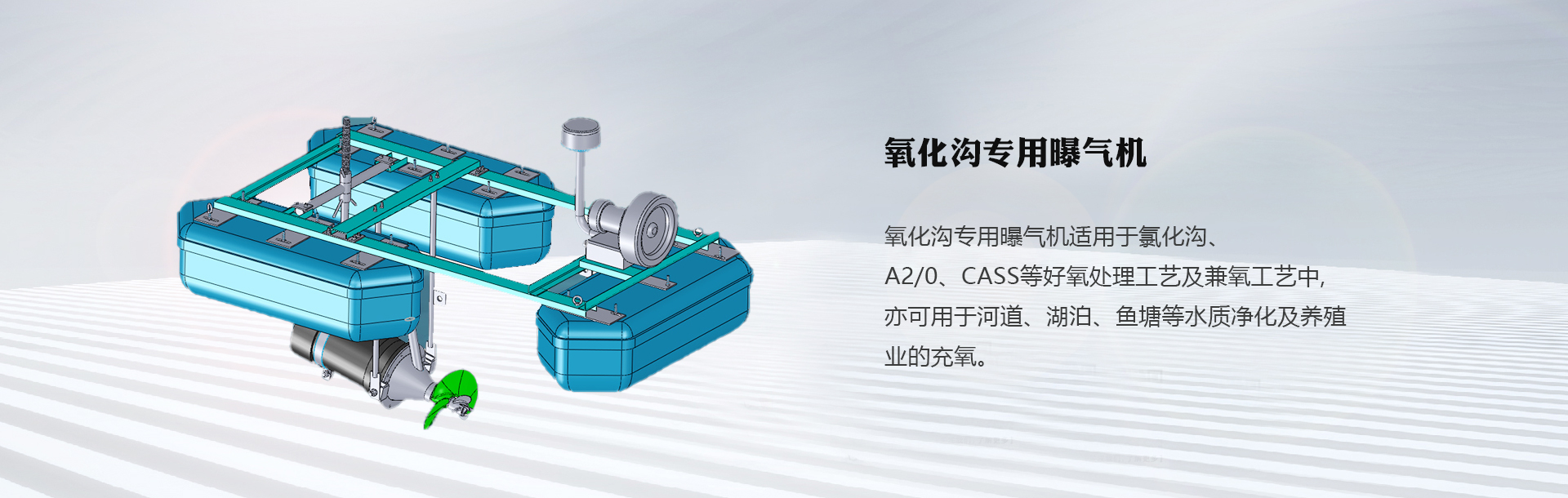 我们的主营产品:污泥干化,污泥深度处理,漂浮式曝气机,浮筒式曝气机,氧化沟曝气机,复叶推流式曝气机等